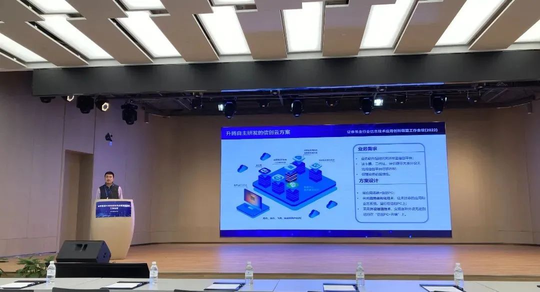会上,升腾智能终端高级产品经理朱星方发表“升腾信创桌面一体化应用方案”的主题演讲,详细介绍了“信创终端、信创外设、软件系统、信创云应用、信创云管控”等主要信创产品和方案,及金融信创未来发展趋势及创新应用。其中重点就“证券基金行业信创整体解决方案”深入分析,主要讲解方案详情及优势,同时分享升腾在证券基金领域的项目落地情况、标杆案例等,充分彰显升腾在金融信创领域的创新实力,获得了与会人员的高度关注。
