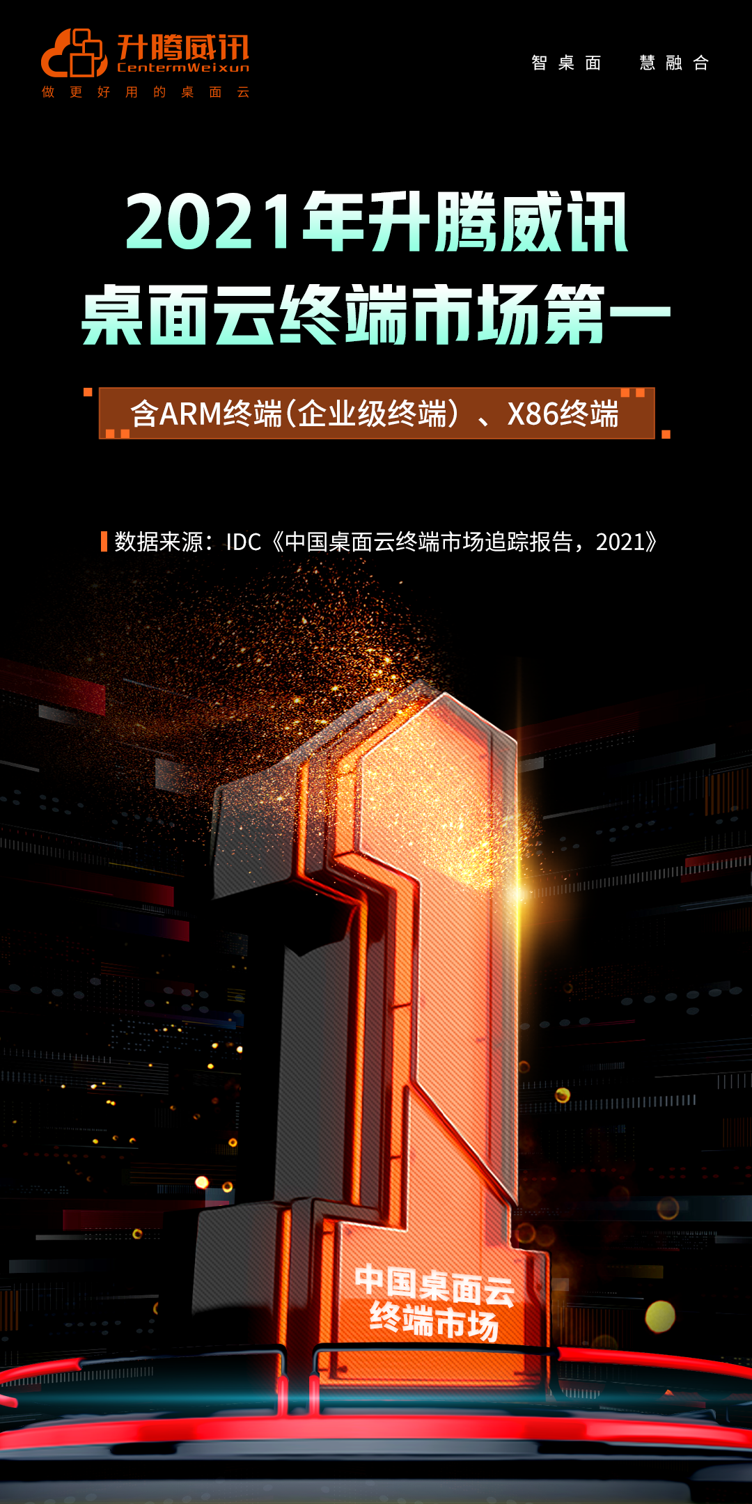 国际数据公司(IDC)发布《2021年中国桌面云终端市场跟踪报告》,中国桌面云终端出货量为175.4万台,升腾占比20.3%,升腾威讯桌面云市场占有率第一!至此,升腾威讯桌面云已连续4年位列第一。