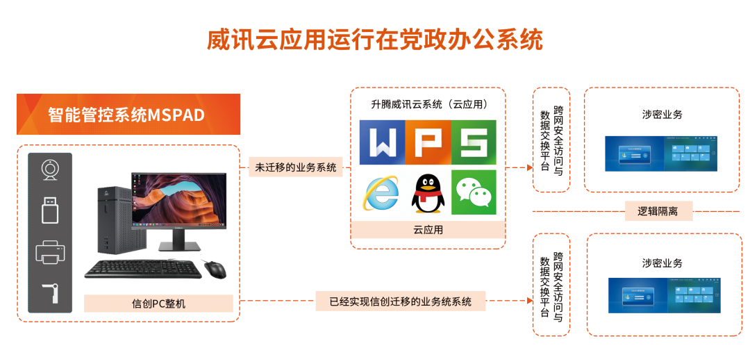 升腾威讯作为业界最早实现云应用迁移方案的厂商,能够很好地解决业务系统迁移适配问题,通过云应用实现未完成改造的业务系统客户端或者第三方业务办公软件在云端部署,并且实现云应用系统与原有业务系统平台对接,在国产自主可控的办公终端和国产操作系统环境下,实现访问云应用与本地应用一致体验,保障业务的连续性。