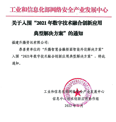 近日,工业和信息化部网络安全产业发展中心公布2021年数字技术融合创新应用典型解决方案名单。升腾资讯申报的两大方案“升腾信创产品威讯云应用”、“升腾智慧金融柜面智能外设解决方案”,历时4个月的方案征集、资格初审、技术中评、区域联合评议、答辩终评以及综合评议,从429家企业单位、663个解决方案案例中脱颖而出,双双入围“2021年数字技术融合创新应用典型解决方案”。