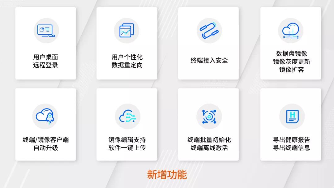 在管理运维上,统一镜像安装、更新:威讯云电脑方案V6.0根据实际使用场景需求,在数据镜像管理、灰度更新、镜像扩容等方面进行更新,支持客户端或虚拟机编辑镜像更新;支持灰度更新,指定个别终端/终端组镜像更新;镜像批量统一网络下发,告别U盘刷机;终端/镜像客户端自动升级;支持在线导出健康报告,项目部署完成的标准交付