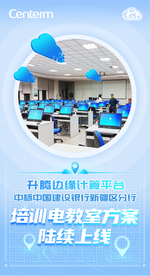 基于建行新疆区分行培训电教室升级改造的需求,升腾率先为新疆建行区分行部署边缘计算培训电教室解决方案,配备“云端+客户端”,以及云端主服务器。通过升腾边缘计算平台服务器,可实现管理、存储资源集中化、共享化,可对资源按需分配管理、动态调度,以最优化成本方式获取超级计算服务,是解决培训电教室管理、传统桌面终端运维难题的优选方案。