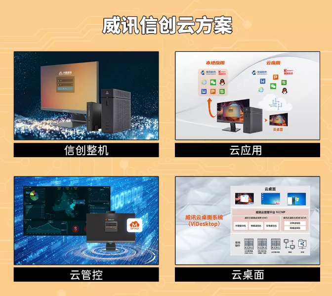 升腾威讯充分发挥自研桌面云技术优势,围绕“云+信创”发展战略,实现“信创整机”、“信创云桌面”、“信创云应用”、“信创云管控”重点布局产品方向,形成党政云办公、金融信创云办公、企业信创云办公等深度融合信创行业场景的整体解决方案,通过云应用、云管控、云桌面等多种方案模式,对应解决党政办公场景中应用迁移、设备管理、数据安全等难题。