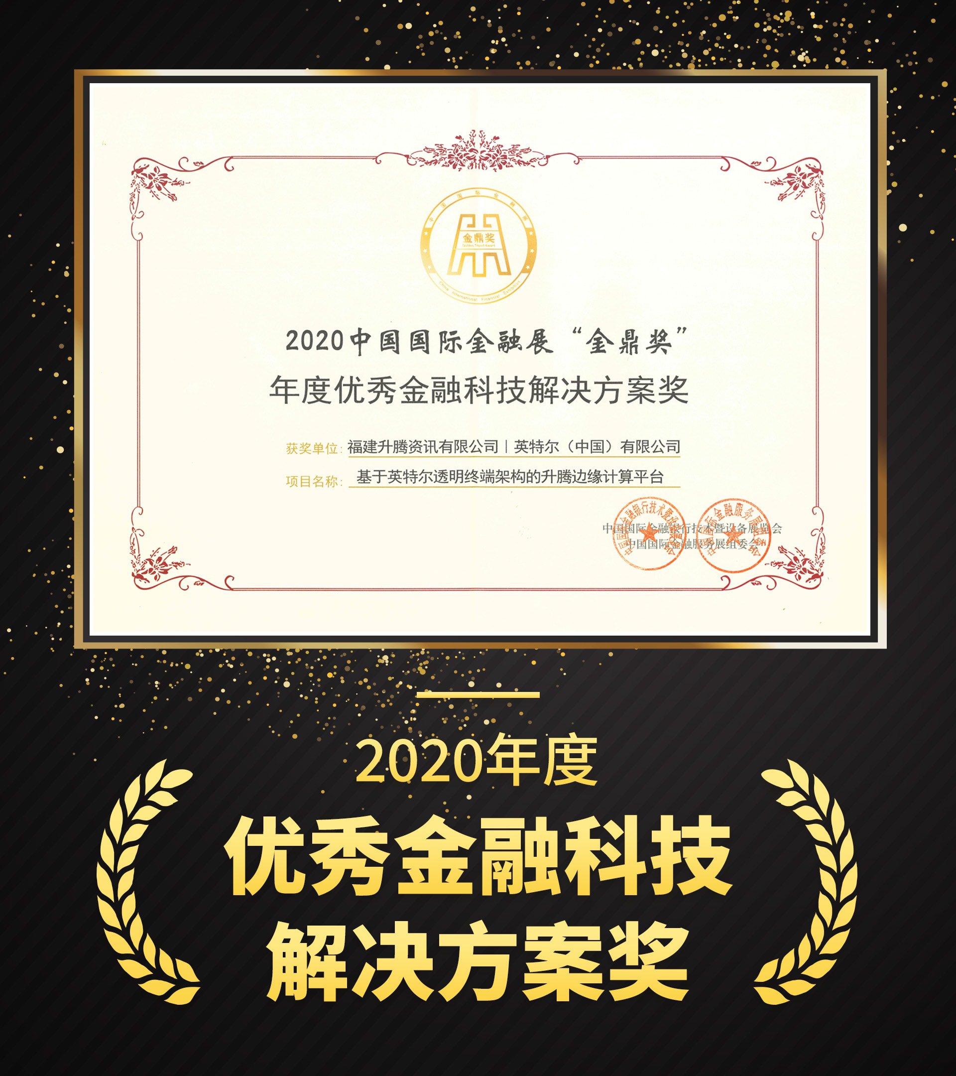 近日揭晓的“金鼎奖”评选中,福建升腾资讯有限公司联合英特尔(中国)有限公司荣膺“2020年度中国国际金融展‘金鼎奖’——年度优秀金融科技解决方案奖”。升腾凭借强大的创新价值、应用方案以及行业影响力第九次斩获“金鼎奖”,这是对升腾资讯在智能金融领域的综合实力表示权威肯定!