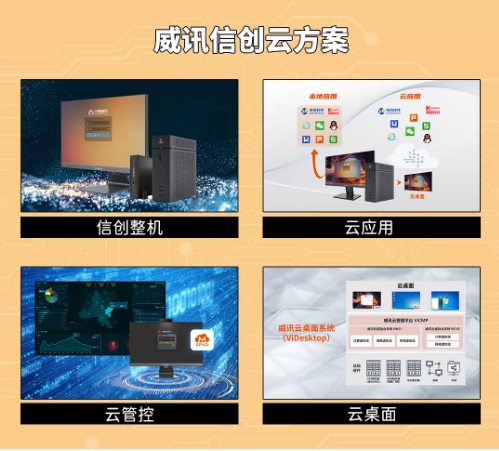 从目前来看,全国各地的信创工作主要是从云计算、软件、硬件、安全等几个领域推进和发展。升腾威讯作为中国信创产业独角兽,发挥自主研发的终端和桌面云领先厂商的优势,在产品技术上,覆盖全系列信创终端和服务器,以及威讯信创云方案;在合作生态上,升腾威讯与合作伙伴深度配套,产品互认证,形成完整的产业生态链。升腾威讯致力于扛起信创大旗,为信创产业发展注入强劲动力,与生态合作伙伴携手一起推动信创产业建设。
