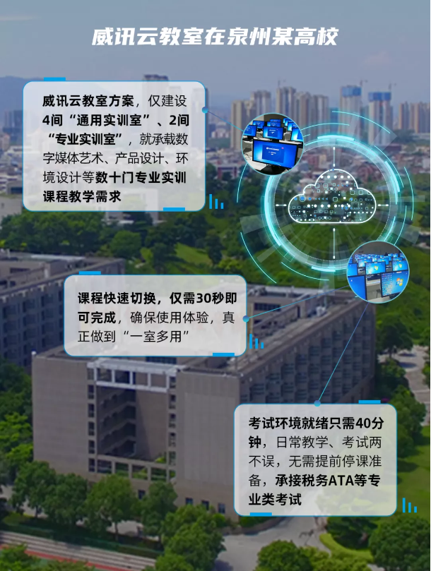 威讯云教室方案基于“模块化”设计架构,根据实际项目需要,融合专业实训教室、通用机房、利旧PC机房等复杂应用场景,在这个项目中实现“统一云端管理”的效果。