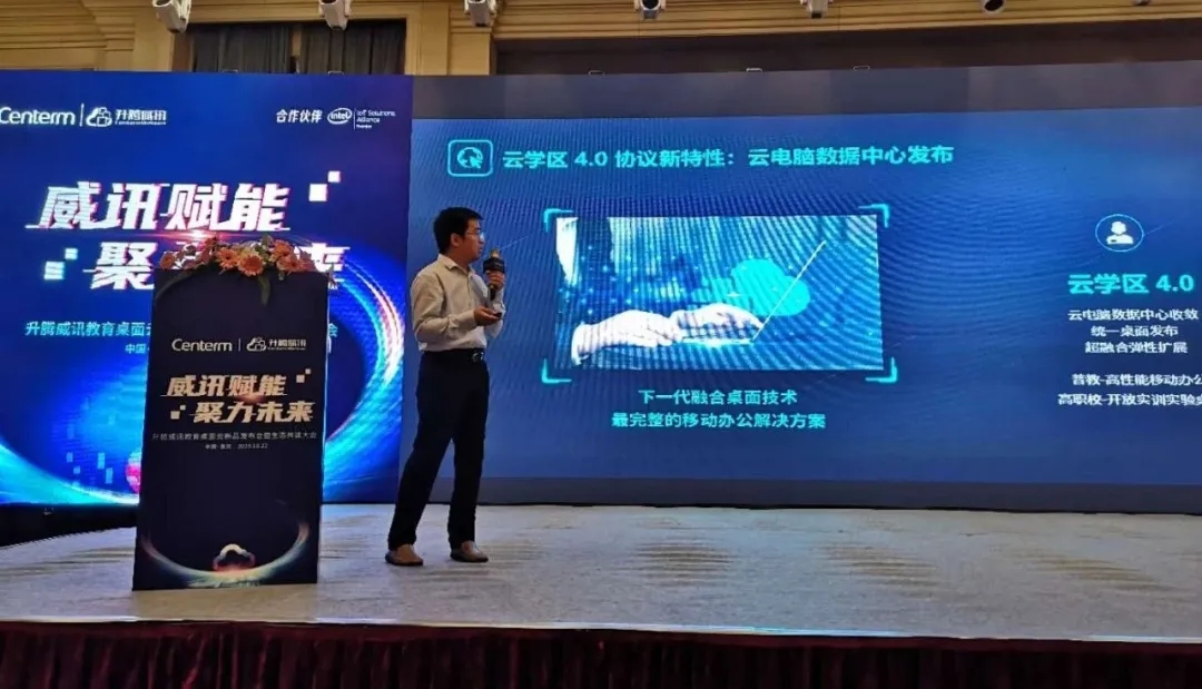 围绕教育信息化2.0行动数字化校园建设目标,通过课程、空间与技术融合,让越来越多的应用服务场景走向校园师生,让科技服务教育。此次发布会,由升腾桌面云事业部教育产品总监 陈欣为大家隆重发布新一代教育桌面云系列新品:威讯云教室V6.0、专业云教室方案、威讯云学区V4.0。