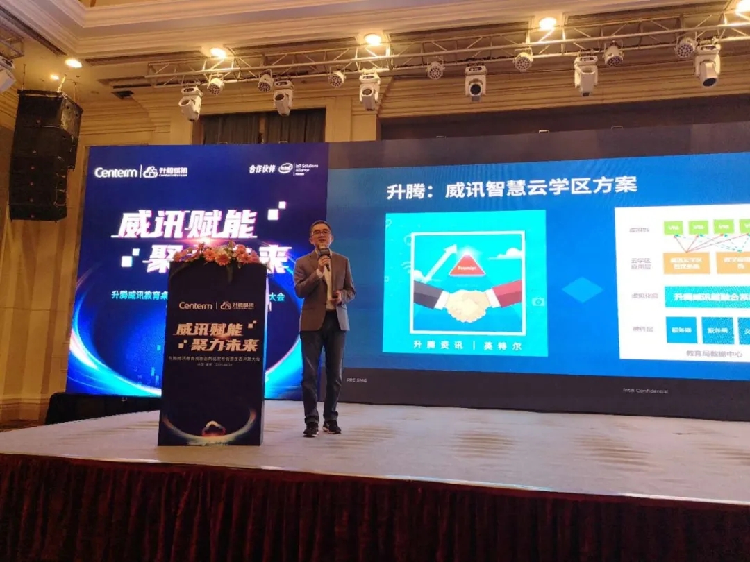 升腾桌面云事业部 副总经理 陈木土作《威讯赋能,聚力未来》主题分享,围绕“教育信息化2.0”融合、智能、创新等新特点,教育信息化从技术、平台、场景等基础平台的搭建走向信息技术与教育模式的深度融合和创新。威讯桌面云方案通过统一架构,定制场景化方案,解决基础设施孤岛问题,为深度融合、智能创新提供必需的基础能力。通过融合行业、融合生态,融合行业应用场景,开放生态合作模式,与合作伙伴紧密合作,赋能合作伙伴,为用户提供真正好用的场景化整体解决方案,全面领跑教育信息化2.0。