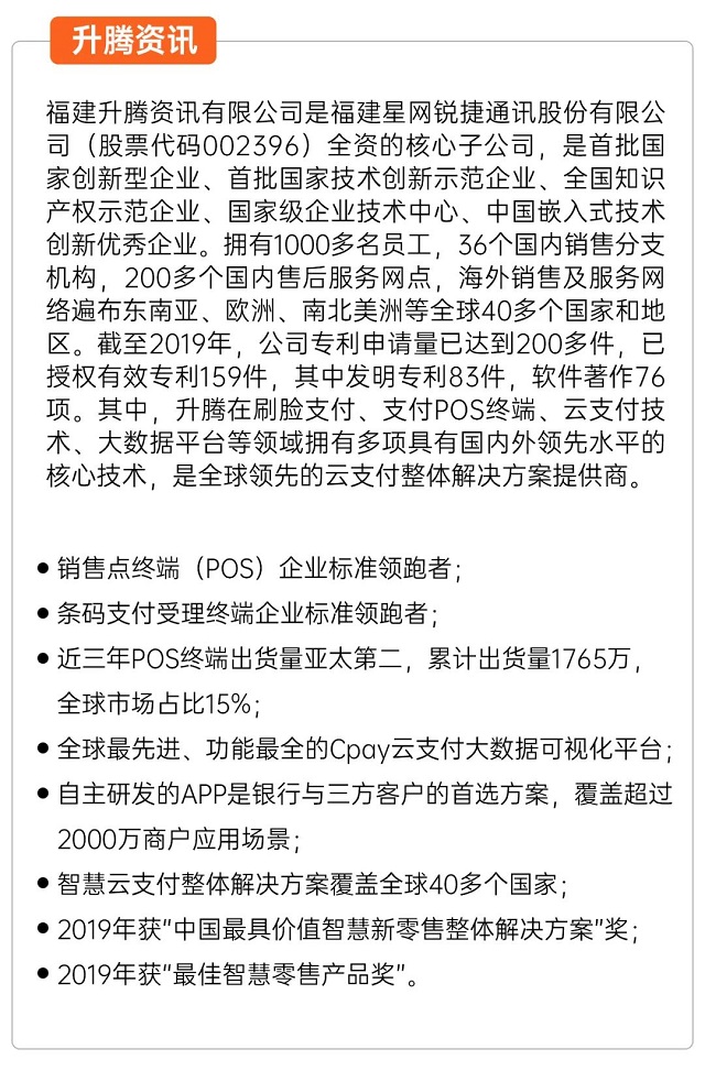 此次入围的刷脸支付终端和智能收银机系列,是基于升腾18年来在支付领域的积淀,融合了最新的人工智能、大数据、云计算、生物识别等技术推出的重磅产品,是新零售全域解决方案中的重要一环。旨在为华夏客户提供更高效率、更安全便捷的产品服务和体验,与华夏的业务深度贴合,助力客户向数字化、智能化、个性化方向转型。与此同时,依托于升腾在新零售市场的多年积累与深度洞察,升腾推出了业内首款专注于银行客户需求的“轻量级”、“全场景”的“星亿腾新零售整体解决方案”。该方案支持AI智能识客、数字化客流分析、多样化营销、一站式进销存管理等功能,可全面助力华夏银行在新零售市场数字化竞争中的化繁为简,快速部署,从而为传统零售的数字化、智能化转型加码提速。