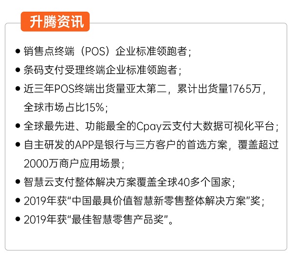 升腾是上市企业星网锐捷通讯股份有限公司(002396)的全资控股子公司,是全球领先的云支付整体解决方案提供商。拥有福州、成都、武汉、上海和厦门等五个研发机构所组成的研发中心,600余位具有丰富经验的研发人员。18年来,升腾已服务邮政集团、交行、建行、中行、招行、华夏、光大、农信、拉卡拉等全国30多个总行、总公司及省联有着深层次的合作。其产品与解决方案已应用于全球40多个国家与地区,涵盖金融、银行、零售、餐饮、保险、批发市场、酒店、交通等各大领域。通过云支付整体解决方案,围绕全场景,帮助银行和第三方支付机构构建精细化、精确化、立体化的服务模式,为其业务创建市场新契机,同时满足客户的新零售变革需求。