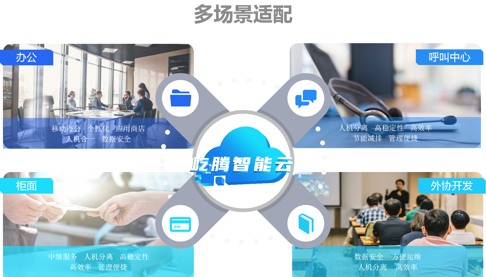 目前,升腾屹腾智能云方案已在全国多个金融机构成功落地部署,实现多行业、多场景的适配,不仅满足日常办公的需要,同时也适用于“行业办公、金融柜面、多媒体会议室、呼叫中心、以及外协开发”等场景。
