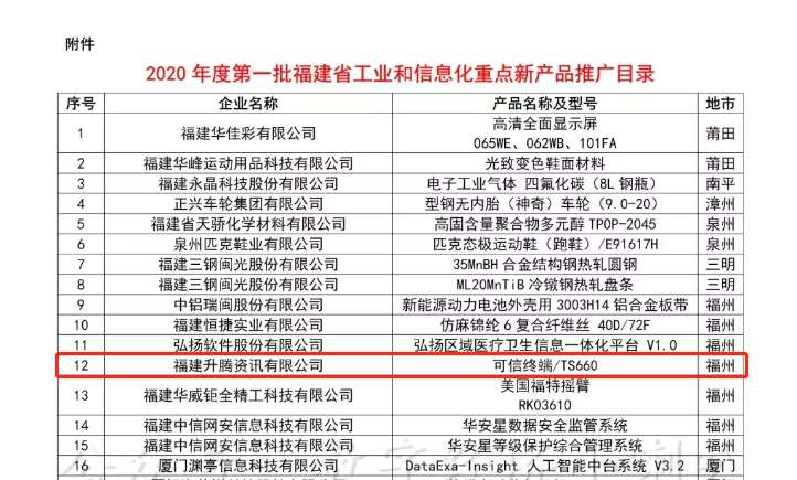 日前,福建省工业和信息化厅发布了《2020年度第一批福建省工业和信息化重点新产品推广目录》,福建升腾资讯有限公司自主研发的“可信终端”经评审认定,上榜“重点新产品推广目录”,是第一批获此殊荣的企业,代表了省工信厅对升腾创新能力的高度认可。