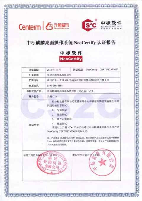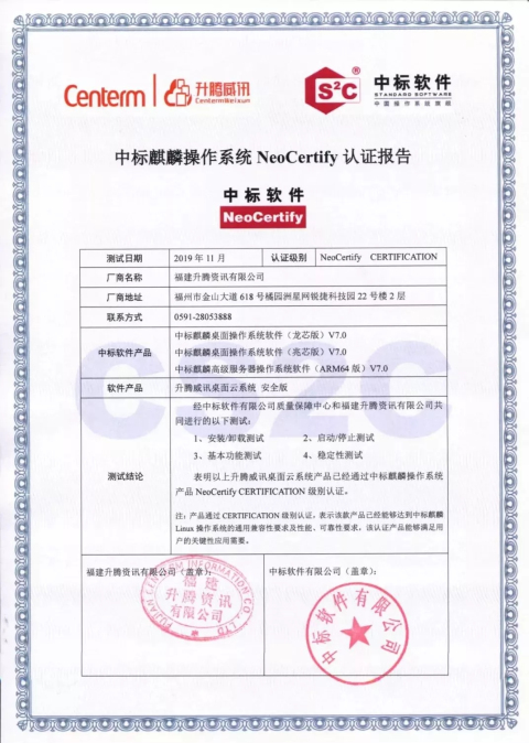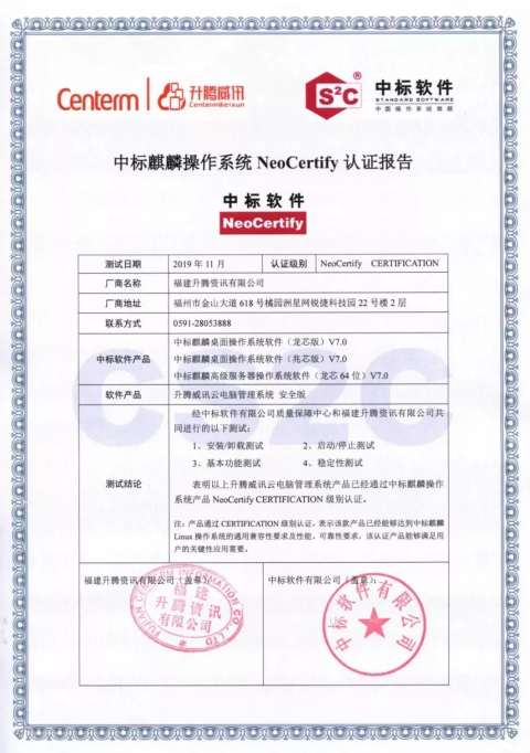 测试结果表明:升腾威讯云电脑管理系统 安全版/升腾威讯云桌面管理系统 安全版与中标麒麟桌面操作系统软件(龙芯、兆芯)V7.0 /中标麒麟高级服务器操作系统软件(龙芯64位、ARM64位) V7.0 上完成产品兼容互认证,在安装/卸载测试、启动停止测试、基本功能测试、稳定性测试等均达成预期目标。