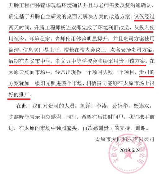 在孝义四中云办公的项目中,升腾技术工程师深入学校现场环境确认,与老师反复沟通确认,基于原有的方案改造升级,使得升腾桌面云方案能够更好地应用,最终实现在一个虚拟化平台同时发布标准桌面、3D桌面以及GPU支持等,满足校园和其他园区级多样化的客户场景,帮助代理商和客户彻底解决其他厂商原有的产品使用复杂、平台不稳定等顽疾,赢得了学校领导和老师的高度认可,校长在会议上特别点名表扬!