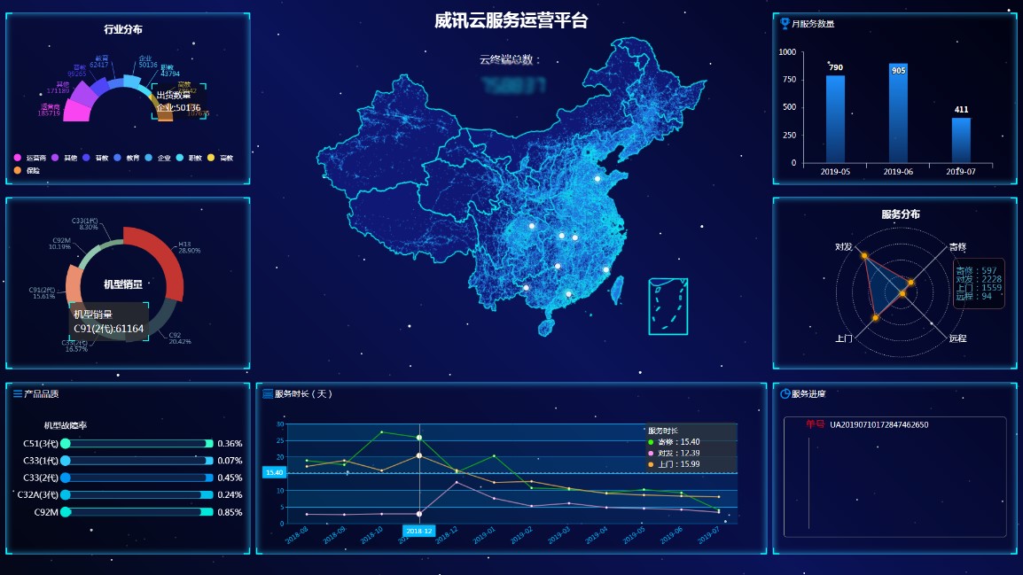 在张辉博士的接待介绍下,曲部长一行人参观了我们威讯云服务运营平台,截止目前,服务平台 终端管理总数已超75万台,及时查看到不同行业的分布情况和服务情况,服务过程监控和进度实时查询,建立多样、高效、敏捷的服务体系,为客户提供更好的服务。