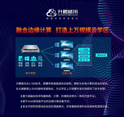 在2019英特尔智慧教育峰会上,升腾展示融合边缘计算的云学区方案,升腾和英特尔在产品级、方案级在桌面云领域展开紧密合作,共同推动桌面虚拟化领先技术的应用。