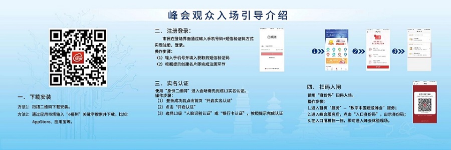 普通观众参展方式:观众只需下载安装“e福州”APP并完成实名认证,在会场入口处点击页面上的“入口身份码”标识,通过闸机扫一扫即可进入峰会现场。