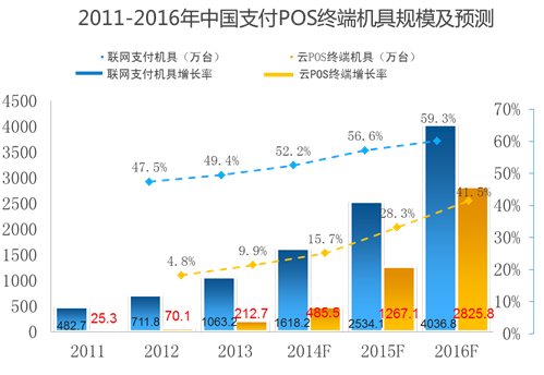 据易观智库发布的《中国云支付业务发展趋势研究报告2014》显示,国内的云支付已进入“高速发展期”。2013年传统POS、电话POS等收单机具总量已达1063万台,预计到2016年市场保有量将达到4036万台。